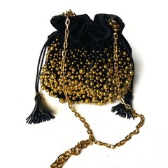 Bolsa feita em veludo cristal preto . O forro é feito com veludo preto, tem um bolso interno com fechamento em zíper. Todas as ferragens são na cor dourada e a alça possui comprimento de 1,30 cm que pode ser ajustado com o regulador no tamanho desejado. Bolsa macia e leve com fechamento nas laterais com cordão são francisco com tassel no mesmo material da alça e um terminal em dourado.